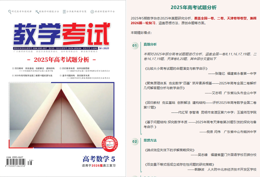 《教學考試》雜志是公開發行的省級教育期刊,國內統一連續出版物號CN 54-1058/G4,國際標準連續出版物號ISSN 2095-2627,已被中國知網收錄。自創刊以來,雜志影響力持續提升,在全國中學師生中樹立了良好口碑,被譽為“良師益友”,并被眾多學校圖書館列為館藏期刊,發行范圍覆蓋國內外,是中高考教學領域的重要參考讀物。