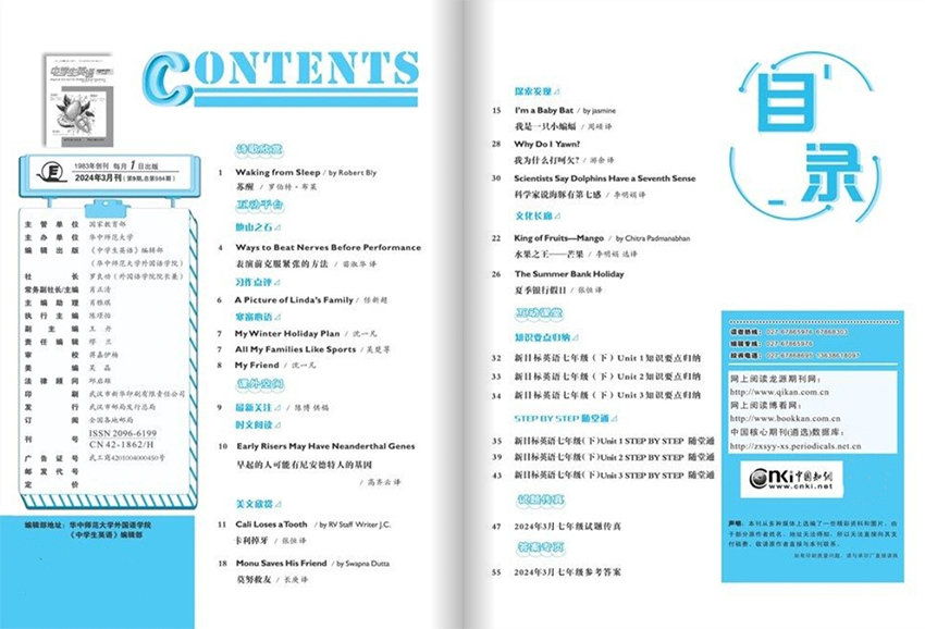 雜志簡介:《中學生英語》是由《中學生英語》雜志社出版的一本初中雜志,創辦于1983,月刊,單期48頁。《中學生英語》以其嚴謹的內容、活潑的形式和卓有成效的輔助作用,贏得了全國無數師生和家長的信賴與喜愛。它不僅是學生學習英語的良師益友,也是教師教學備課的寶貴資源,在我國中學英語教育領域享有極高的聲譽和廣泛的影響力。